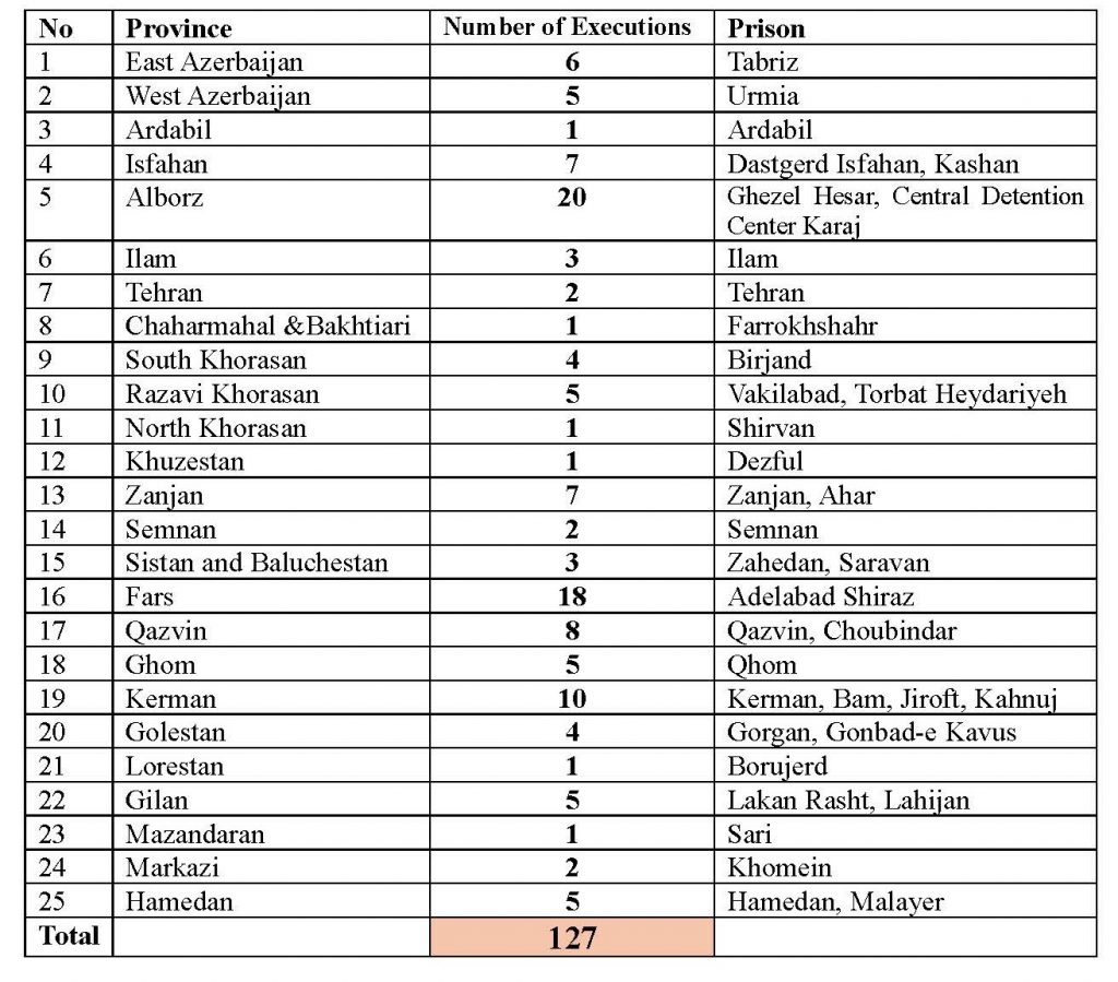 The highest number of executions was reported in Adelabad Prison in Shiraz and Ghezel Hesar Prison in Alborz, each with 18 executions. Following them, Dastgerd Prison in Isfahan had 7 executions, and Ghom (Qom) had 5.