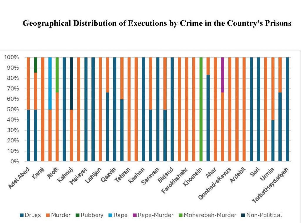 The data shows that the executions from September 22 to October 21, 2024, were carried out for crimes related to drug offenses, murder, rape, theft, “Moharebeh” (waging war against God) and murder, and rape-murder cases.