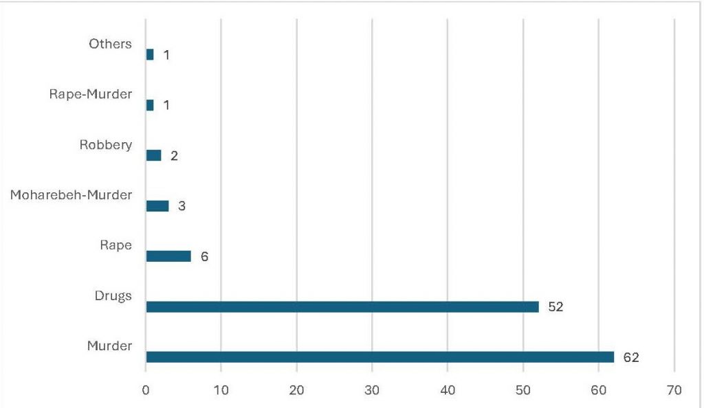 During this period, 62 individuals were executed for murder. Additionally, 2 individuals were executed for “moharebeh” (waging war against God) and murder, and 1 person was hanged for rape and murder. Overall, 51% of the executions this month were related to murder cases. This percentage has not significantly changed from the previous month, when 50% of the executions were for murder. However, it is noticeable that executions for retribution (qisas) have significantly increased in both the previous month and this period.