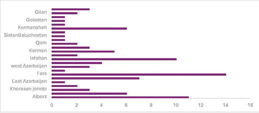 Executions during December 21, 2024 – January 19, 2025, took place in 24 provinces across Iran, involving a total of 33 prisons in various cities. Fars Province recorded the highest number of executions, with 14 carried out in Adelabad Prison. This was followed by Alborz Province, with 11 executions in Ghezel Hesar Prison, and Isfahan Province, with 10 executions in Dastgerd Prison.