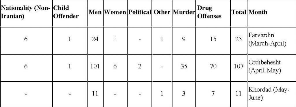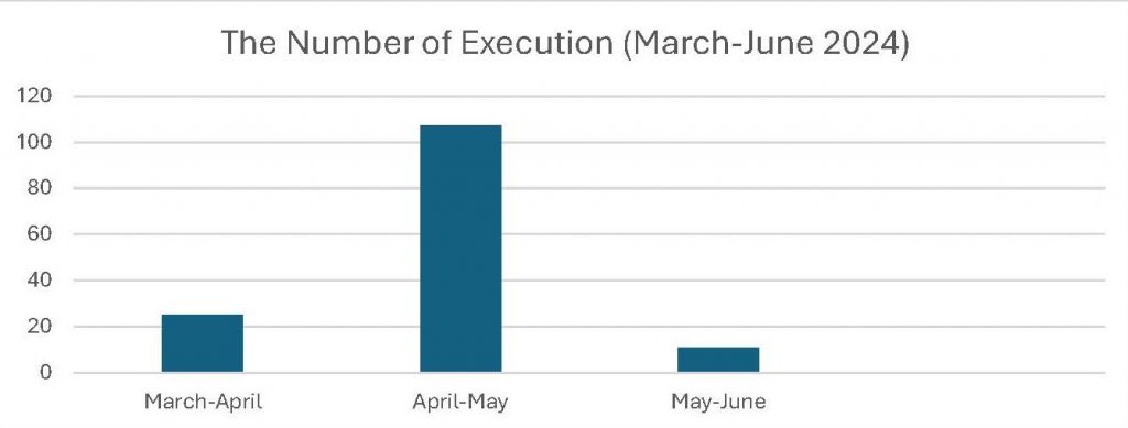 In total, 143 executions were recorded in Iran during the first quarter of 1403 (March 2024 – June 2024). These executions are broken down by month as follows: Farvardin (March-April): 25 executions, Ordibehesht (April-May): 107 executions, and Khordad (May-June): 11 executions.