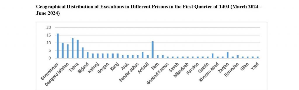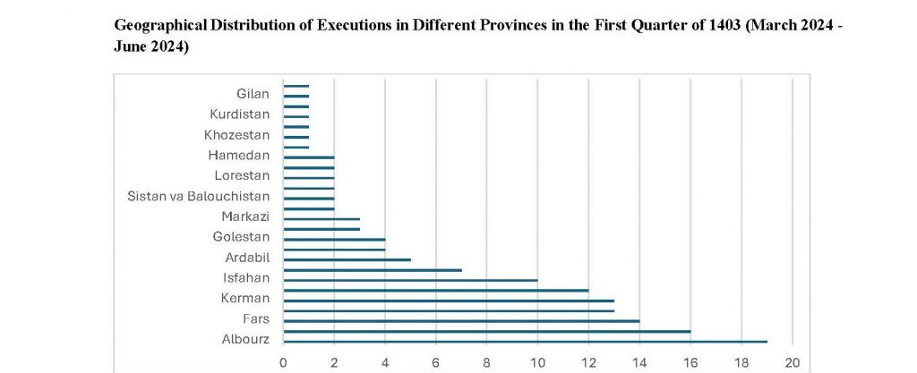 Executions in the first quarter of 1403 (March 2024 – June 2024) took place in 26 provinces and 41 prisons across the country. Among these, the provinces of Albourz, Khorasan Razavi, and Fars had the highest number of executions, with 19, 16, and 14 cases respectively. These regions were followed by Kerman, West Azerbaijan, and East Azerbaijan, which also reported significant numbers of executions. This distribution indicates a notable concentration of executions in specific provinces, suggesting variations in local judicial practices and crime rates.